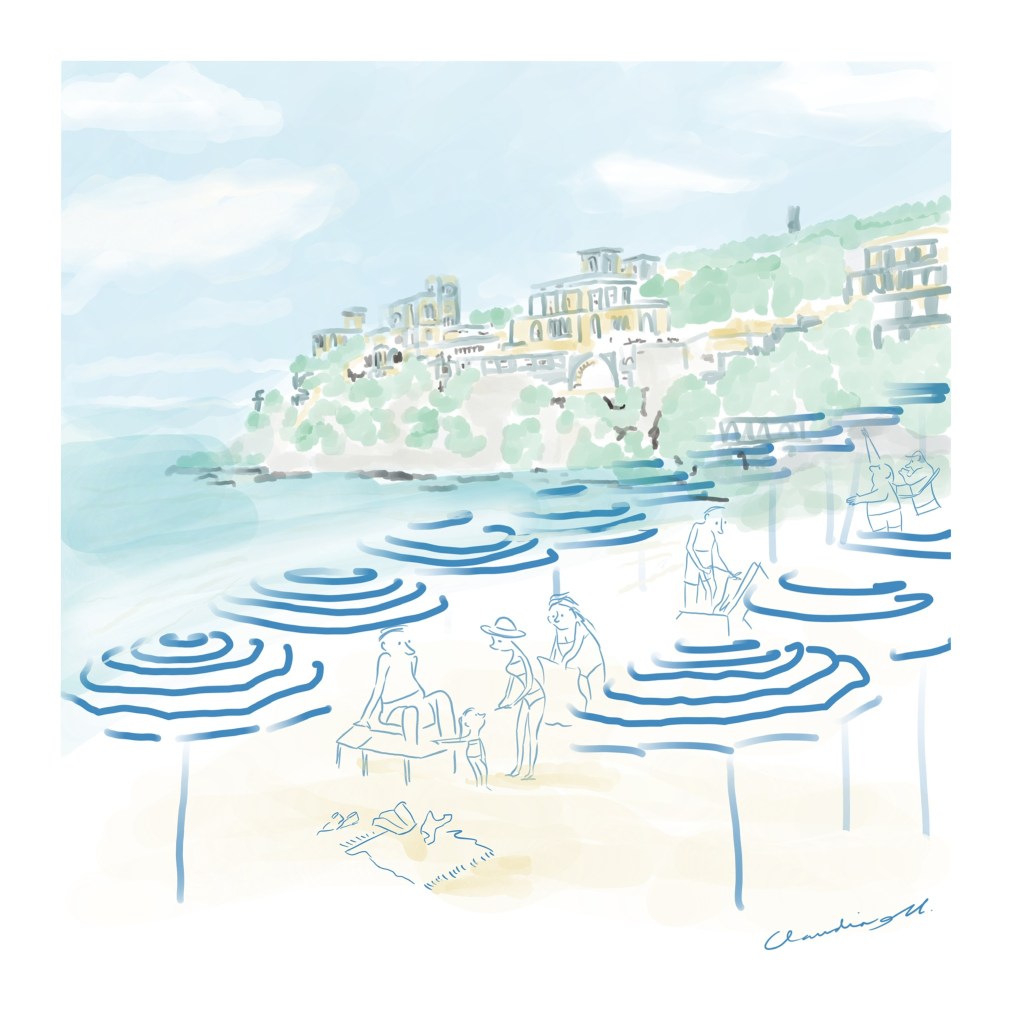 The beach at Castiglioncello on the Tuscan coast of the Tyrrhenian Sea with its colourful umbrellas, a cheerful background and various bathers.